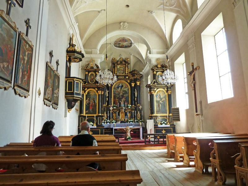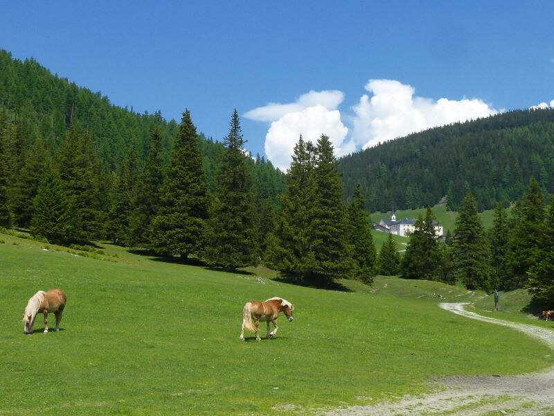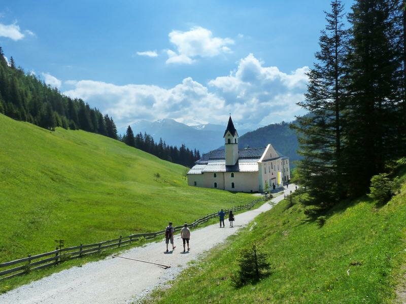 Noch ein Stück weiter vereint sich der Weg mit dem Stationenweg, der von Mieders herauf kommt, und uns nach etwa 1 km zum Wallfahrtsort Maria Waldrast begleitet. Nach dem Besuch der schönen Wallfahrtskirche mit dem bekannten Barockaltar kehren wir im angebauten Gasthaus ein, da Mittagszeit ist. Dann geht es weiter zum Schöpfungsweg, der uns durch die schöne Naturlandschaft zum Labyrinth und zu weiteren gestalteten Plätzen bringt.
