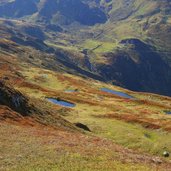 Dort verlässt die Wanderroute Nr. 24 nach einer Kurve den Fahrweg und führt als enger Steig den Wiesenhang hinauf. Je höher es hinauf geht, desto schöner und wilder wird die Landschaft. Kurz unter dem Sidanjoch erstreckt sich ein Netz aus Tümpeln, in denen sich der Himmel spiegelt. Am Joch kreuzen sich Wanderrouten in verschiedene Richtungen. Ein nahes Ziel, rund 30 Minuten entfernt, ist die Rastkogelhütte. Doch auch ohne weiter zu wandern, lohnt sich der Aufstieg: Die Aussicht reicht vom Zillertaler Hauptkamm bis zu den näheren Gipfeln der Tuxer Alpen.