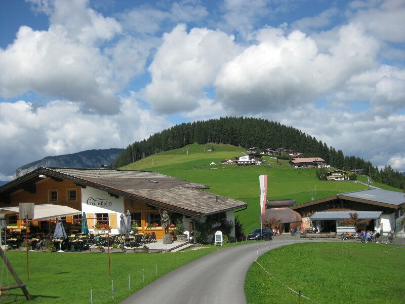 Nachdem wir den ersten Teil des Waldes hinter uns gelassen haben, bieten sich schöne Ausblicke auf die Höfe an den gegenüberliegenden Hügeln und auf das Dörfchen Söll. Hier legen wir eine kurze Pause ein und genießen die Sonnenstrahlen. Nach einer Biegung ist Söll dann nicht mehr zu sehen und der Weg führt an verschiedenen Bauernhöfen vorbei - durch einen sogar zwischen Haus und Scheune hindurch - bis wir das letzte Stückchen Weg vor uns haben. Quer durch den Wald kommen wir nach etwa 1,5 Stunden Wanderzeit an einer asphaltierten Straße heraus. Nun sehen wir die Endstation der Bergbahn Söll und somit das Hexenwasser…
