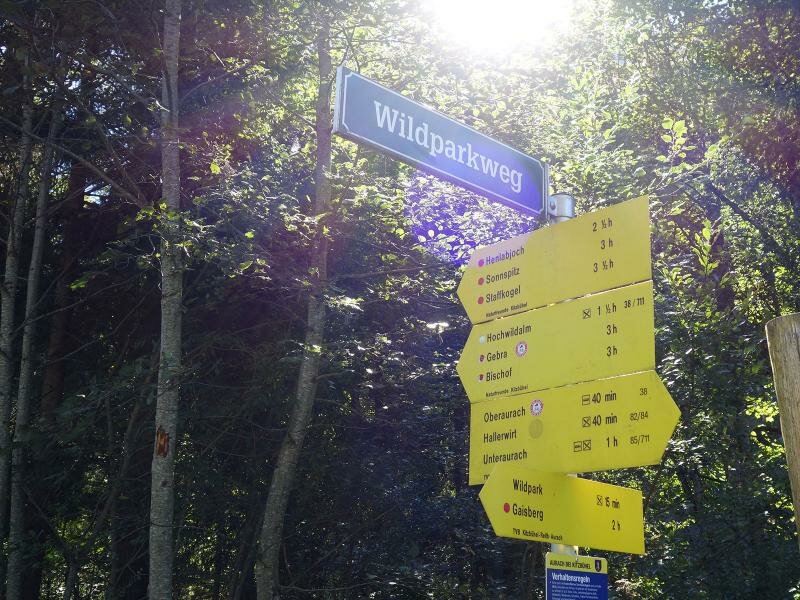 Um zum Ausgangspunkt der Wanderung zum Naturfreundehaus Hochwildalm zu gelangen, fahren wir am Wildparkweg von Aurach bis zum Parkplatz Brander Reibe hinauf. Dort zweigt der Forstweg zur Hochwild Alm ab.