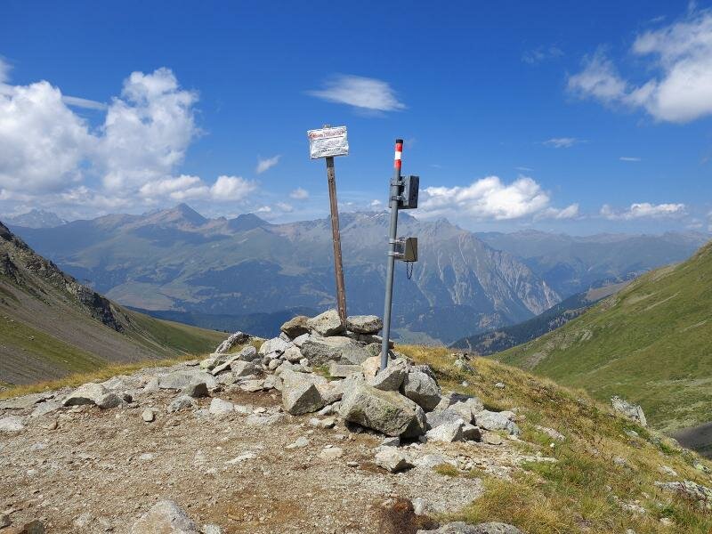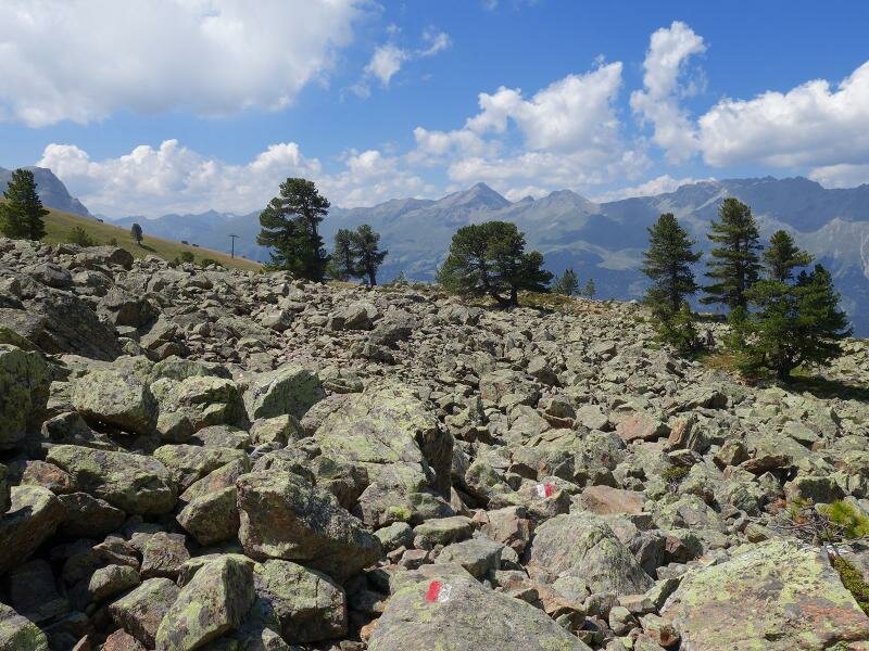 Die Goldseen, zwei blitzblaue Hochgebirgs-Wasserspiegel, liegen in einer Stein- und Geröllwüste im Hochgebirge direkt am Alpenhauptkamm, auf fast 2.600 m Meereshöhe unter der Bergkastelspitze am Reschenpass. Die Kabinen der Bergkastel-Bahn führen uns von Nauders am Reschenpass hinauf auf luftige 2.175 m Meereshöhe. Hier, an der Baumgrenze, folgen wir dem Wanderweg 33 und dann 20 (Goldseen).