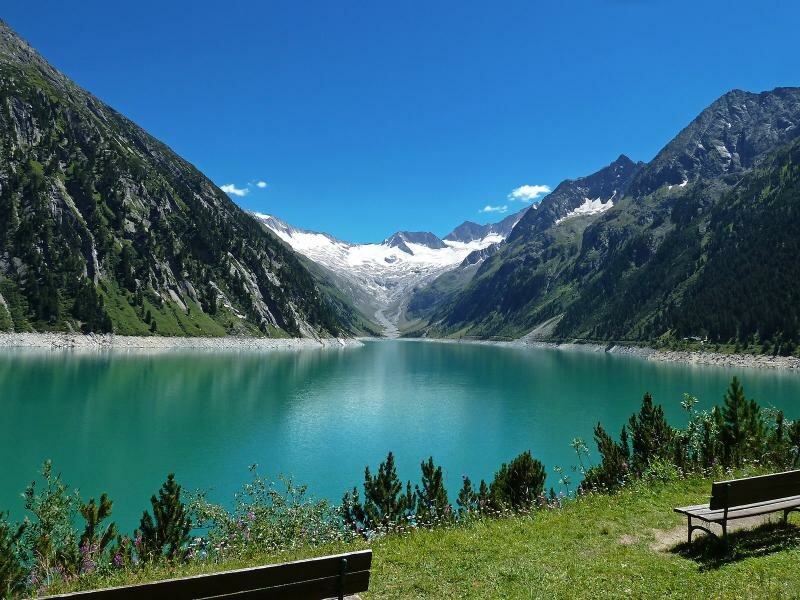 Zurück zum Parkplatz am Schlegeisspeicher geht es dann über den selben Weg, und wir haben zum Schluss noch einmal Gelegenheit, den türkisblauen Stausee am Fuße der Zillertaler Gletscher zu bestaunen (es gibt übrigens mehrere Einkehrmöglichkeiten in Parkplatznähe).