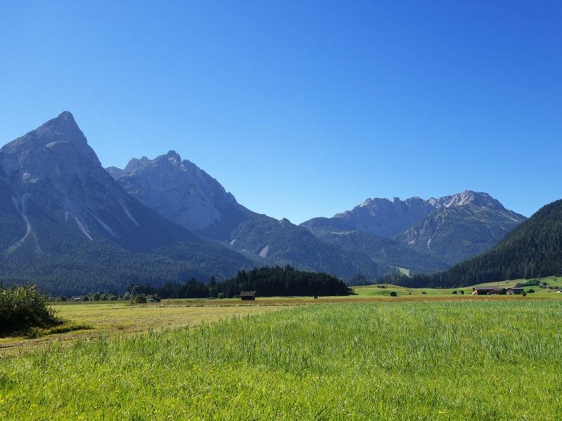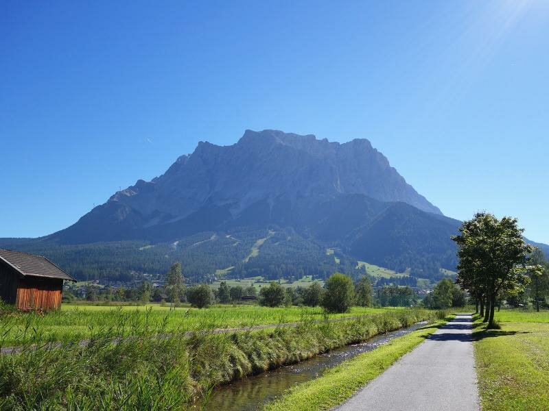 Durch die Wiesen und Weiden am Lermooser Moos führt die Radstrecke R7 - mit Blick auf die mächtige Zugspitze und die Westgipfel der Mieminger Kette. Auf der Höhe des Golfplatzes Zugspitze-Tirol kreuzen sich die zwei Wegvarianten der Radroute: Weiter durch das Loisachtal unterhalb von Ehrwald bis ins bayerische Garmisch-Partenkirchen, oder über Bichlbach und Heiterwang nach Reutte. Diese zweite Wegvariante durch das Zwischentoren-Tal entspricht der Via Claudia Augusta, dem Radwanderweg, welcher einer alten Römerstraße von Augsburg nach Venedig folgt.