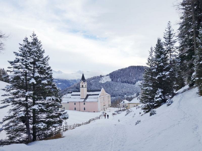 Der Wallfahrtsort Maria Waldrast über dem Stubaital und Wipptal lässt sich auch im Winter in einer Rundwanderung entdecken.