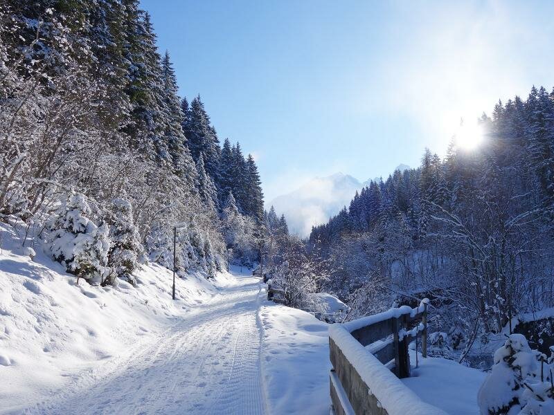 Ein dichter Wald umgibt das Tal, und je weiter wir aufsteigen, desto dicker wird die Schneedecke, die am Boden liegt und die Äste der Bäume bedeckt. Kurz vor Erreichen der Talstation des Skigebietes Axamer Lizum kommen wir an einer Wegkreuzung vorbei und folgen dem Forstweg zur Schafalm. Über eine Brücke geht es dann wieder an der Westseite des Tals ein Stück aufwärts.