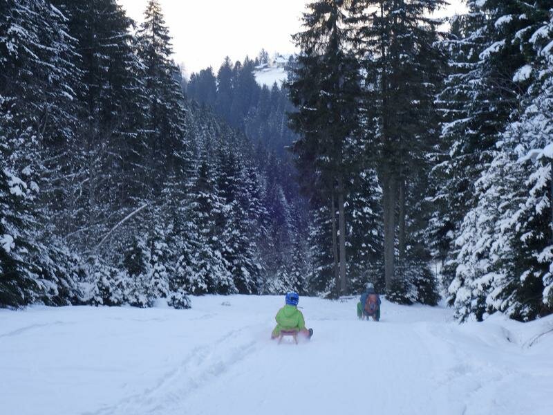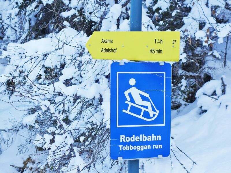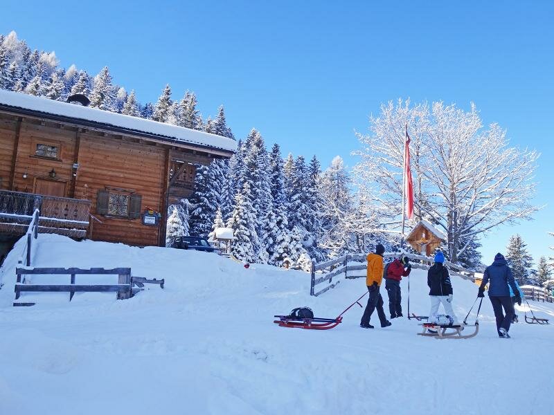 Bei der Almhütte kreuzen sich die Rodelpisten - besonders Winterwanderer und Rodler machen hier eine Einkehr. Nach dem Essen geht es zuerst hinab zur Talstation des Skigebietes Axamer Lizum und von dort über die Rodelbahn, die dem Talweg folgt, hinab ins Tal. Am wenigsten Mühe und am meisten Spaß dabei hat man natürlich auf einer Rodel!