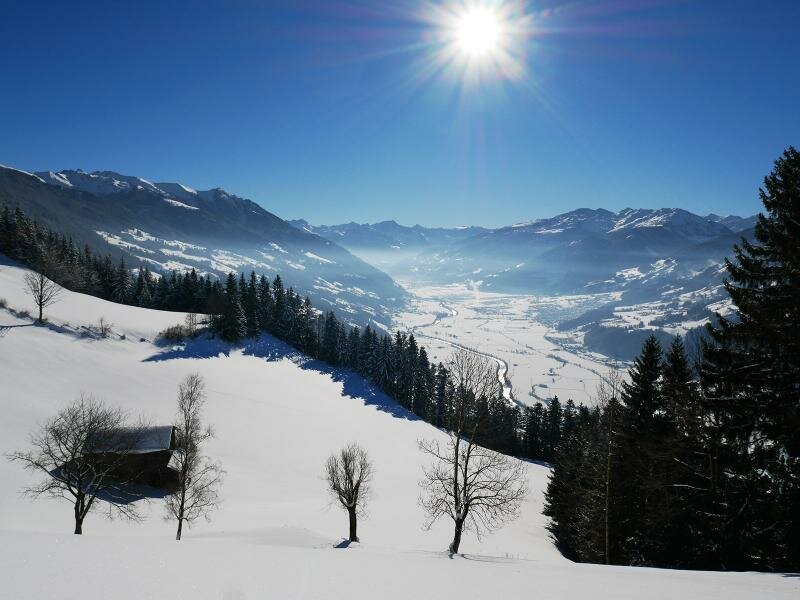 Wo die Bäume sich lichten, wird der Blick auf das verschneite Unterinntal zwischen Münster und Kramsach frei. Aus dem Schatten des Waldes geht es heraus zu den Höfen von Hinterkogel, die sich auf einer Lichtung auf rund 1.150 m Meereshöhe oberhalb von Bruck am Ziller befinden. Hier öffnet sich auch die Aussicht auf das Zillertal.